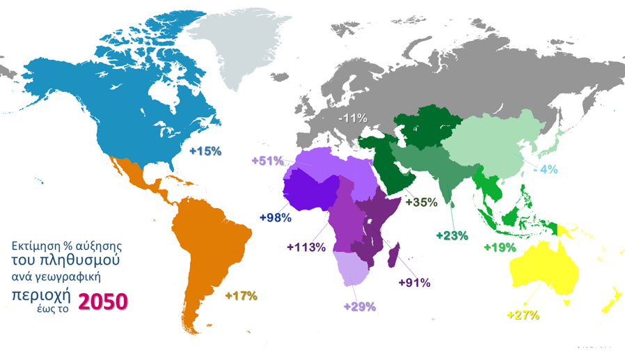 Χάρτης 2:Τα επόμενα χρόνια η αύξηση του πληθυσμού θα προέλθει κυρίως από τις χώρες της Αφρικής, λόγω του νεανικότερου πληθυσμού τους και του υψηλότερου αριθμού παιδιών που αποκτούν οι γυναίκες εκεί. Εκτίμηση ποσοστού αύξησης παγκόσμιου πληθυσμού ανά γεωγραφική περιοχή έως το 2050