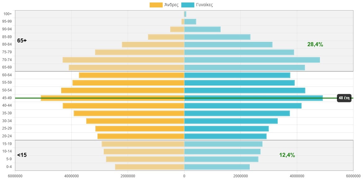 Ευρώπη: Στον αντίποδα, η γεροντική, κατά ηλικία, δομή του πληθυσμού στην Ευρώπη θα οδηγεί σε πληθυσμιακή μείωση, εξέλιξη η οποία δεν μπορεί να αντισταθμιστεί από την γονιμότητα μέσος αριθμός παιδιών ανά γυναίκα, η οποία θα βρίσκεται σε χαμηλά επίπεδα.