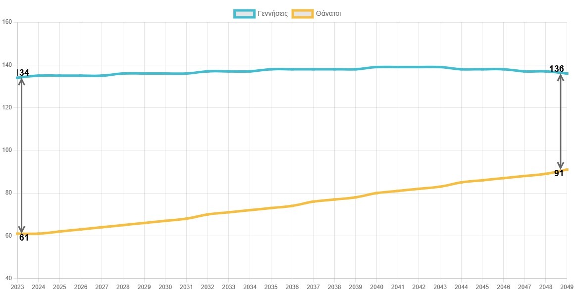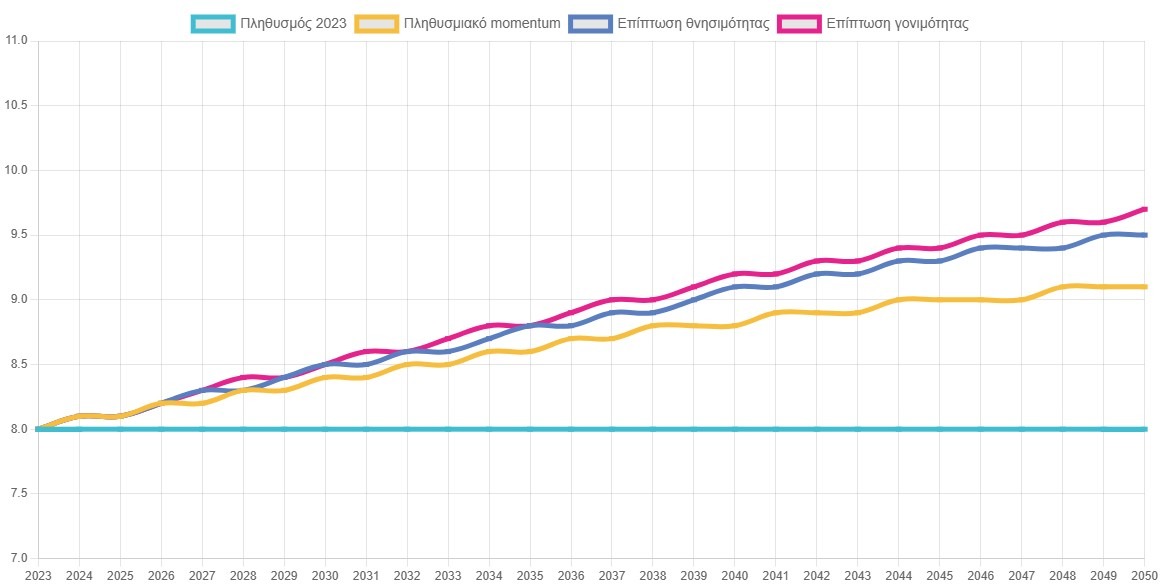 Οι δύο βασικοί παράγοντες που επηρεάζουν το μέγεθος ενός πληθυσμού είναι ο αριθμός των γεννήσεων και των θανάτων που σημειώνονται σε αυτόν. Για τις επόμενες δεκαετίες, λοιπόν, αναμένεται οι γεννήσεις να είναι περισσότερες από τους  θανάτους και όσο αυτό ισχύει ο πληθυσμός θα συνεχίσει να αυξάνεται. Ωστόσο, αν και η διαφορά μεταξύ γεννήσεων και θανάτων ( φυσικό ισοζύγιοη διαφορά των θανάτων από τις γεννήσεις ) θα παραμείνει θετική τις επόμενες δεκαετίες, θα γίνεται όλο και μικρότερη. Αυτό σημαίνει ότι ο πληθυσμός θα συνεχίζει, μεν να αυξάνεται αλλά με μικρότερους ρυθμούς.