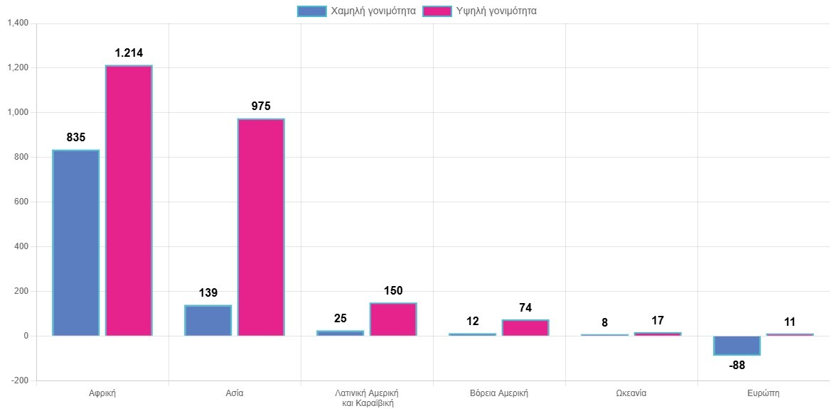 Πίνακας 2:Οι χώρες με τη υψηλότερη γονιμότητα βρίσκονται στο σύνολό τους στην υπο-Σαχάρια Αφρική ενώ οι χώρες με τη χαμηλότερη γονιμότητα βρίσκονται στην Ανατολική Ασία και την Ευρώπη Οι 10 χώρες με τη υψηλότερη και τη χαμηλότερη γονιμότητα