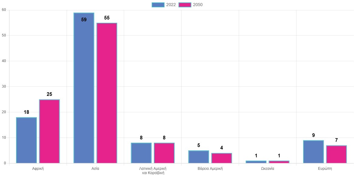 Παγκόσμιος πληθυσμός ανά ήπειρο (για 100 άτομα), 2022 – 2050